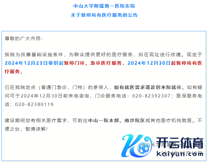 把柄公告 暂停服务是因为 该院将在旧址进行转换扩建 中山一院东院为改善基础才气条目,提供更好的医疗服务,拟在现址进行改建。将于2024年12月23日零时起暂停门诊、急诊医疗服务,2024年12月30日起暂停所有这个词医疗服务。 公告指示,已在该院定点(等闲门急诊、门特)的参保东谈主,如有就医需求请实时来院就诊。如有疑问可于2024年12月30日前回电斟酌,门诊服务电话:020-82392307;医保服务电话:020-82380119。 改扩建早有指标 早在2021年2月5日 国度卫生健康委便公布了 对于中山大学从属第一病院 总体发展拓荒指地点批复 批复深切,中山大学从属第一病院是一所集医疗、教学、科研、驻扎保健和康复为一体的三级甲等概括病院,由坐落于广东省广州市越秀区中山二路58号和中山二路1号的院本部、黄埔东路183号的东院区构成。病院指标总床位数3956张。临床教学规模2126东谈主(学生)/年。指标总占大地积7.7万无边米,指标总建筑面积57.6万无边米。 其中,院本部指标定位为区域危重症和疑难病症调理中心,通过指标拓荒,院本部分为医疗区、概括配套区和生涯服务区。 东院区指标定位为心脑血管疑难救治中心,通过指标,东院辞别为医疗区和后勤保险区,主要建筑有门诊入院概括楼、配电房和拓荒楼等。