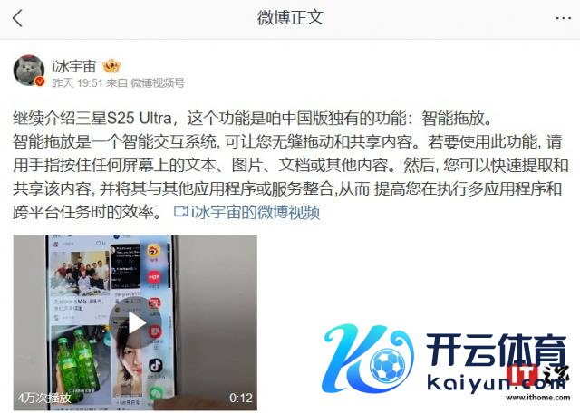 博主 @i 冰天地 昨日发文通晓,S25 Ultra 国行版机型独占"智能拖放"功能。博主称该功能是一个智能交互系统,可让用户无缝拖动和分享本体。用户的手指长按屏幕上的文本、图片、文档或其他本体后,可索要和分享该本体,并将其与其他诈骗步伐或就业整合。